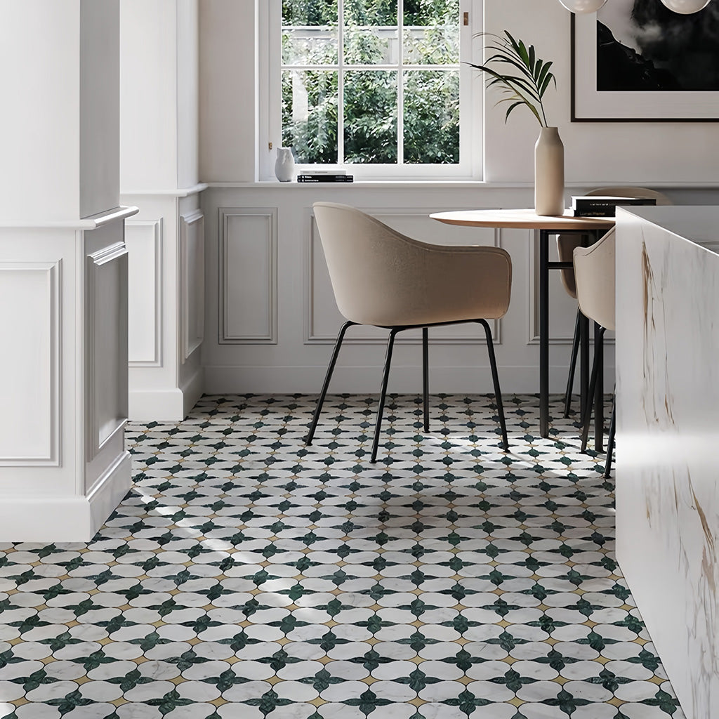 Transform your space into a showstopper with our Floral Leaf Metal & Stone Mosaic Tile — a striking mix of natural Carrara marble, rich green marble foliage, and brushed gold metal accents. Made to elevate kitchens, bathrooms, accent walls, and entryways, this mosaic tile brings a touch of botanical elegance and modern luxury to any interior.