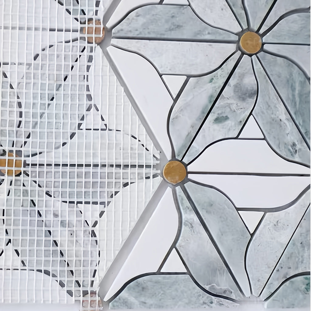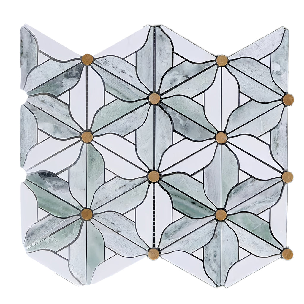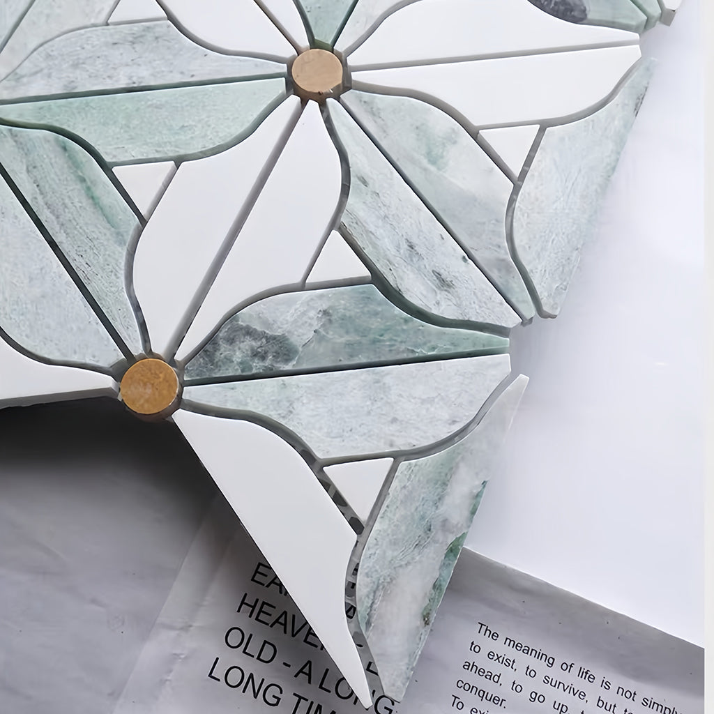 Dive into the world of luxury with our exceptional marble tiles mosaic! Crafted from premium marble, these beauties are precision - cut using advanced water - jet technology. Dominated by vibrant green stone tiles and complemented by elegant Carrara white marble, they form a mesmerizing pattern—like a bright green flower “carved” into a backdrop of white, making them true artistic masterpieces for space decoration.